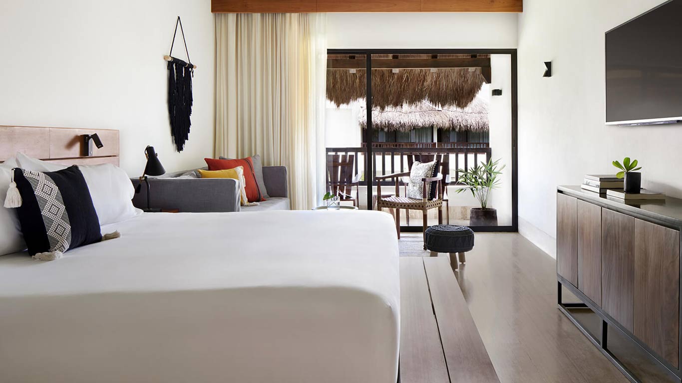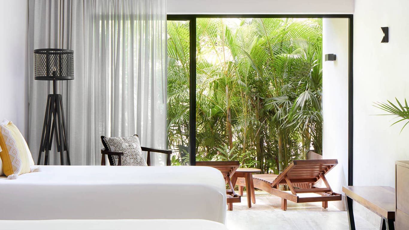 Relax in the Essential Room at Kimpton Aluna Tulum Resort. 412.36 square feet / 125.6 m2 - Terrace - Yoga mat - Cozy bathrobes - iHome speaker - Atelier Bloem bath amenities