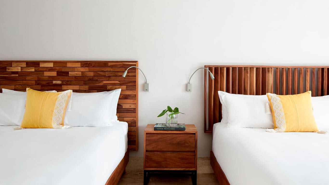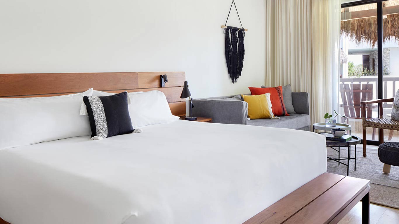 Relax in the Premium Room at Kimpton Aluna Tulum Resort. 412.36 square feet / 125.6 m2 - Terrace - Yoga mat - Cozy bathrobes - iHome speaker - Atelier Bloem bath amenities